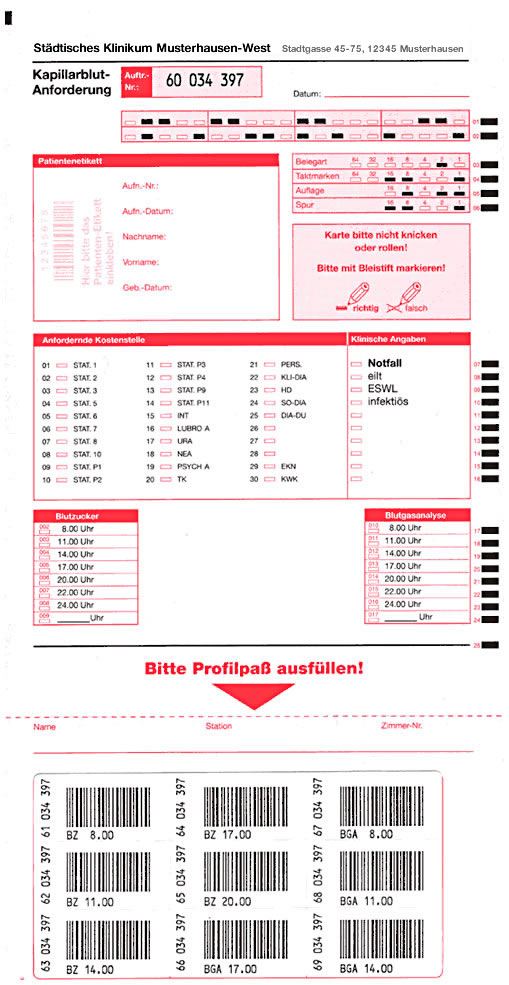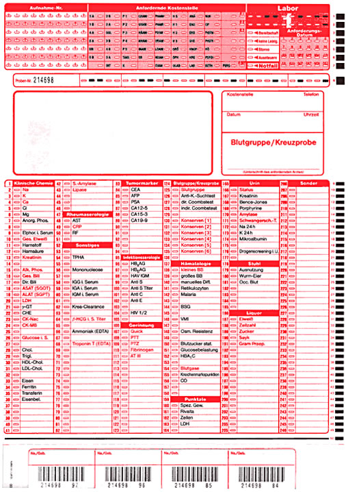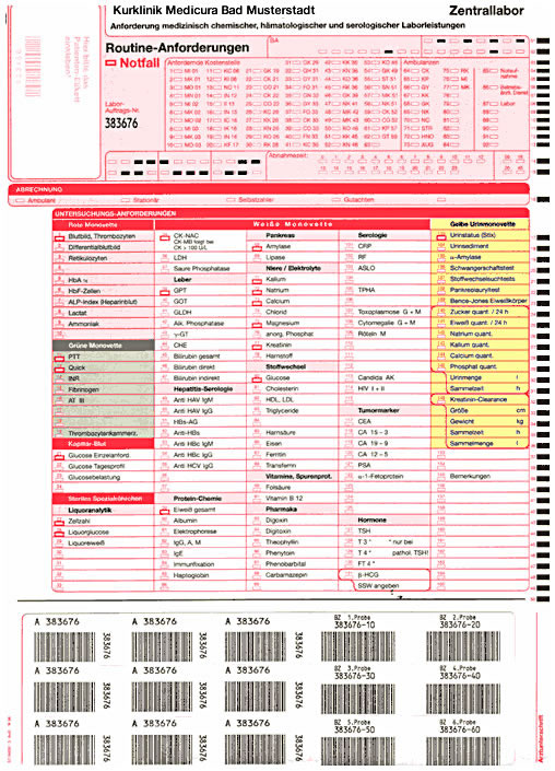 Hier sehen Sie vier Beispiele für die Konzeption medizinischer Laborformulare mit und ohne Barcode-Etikettierung.
